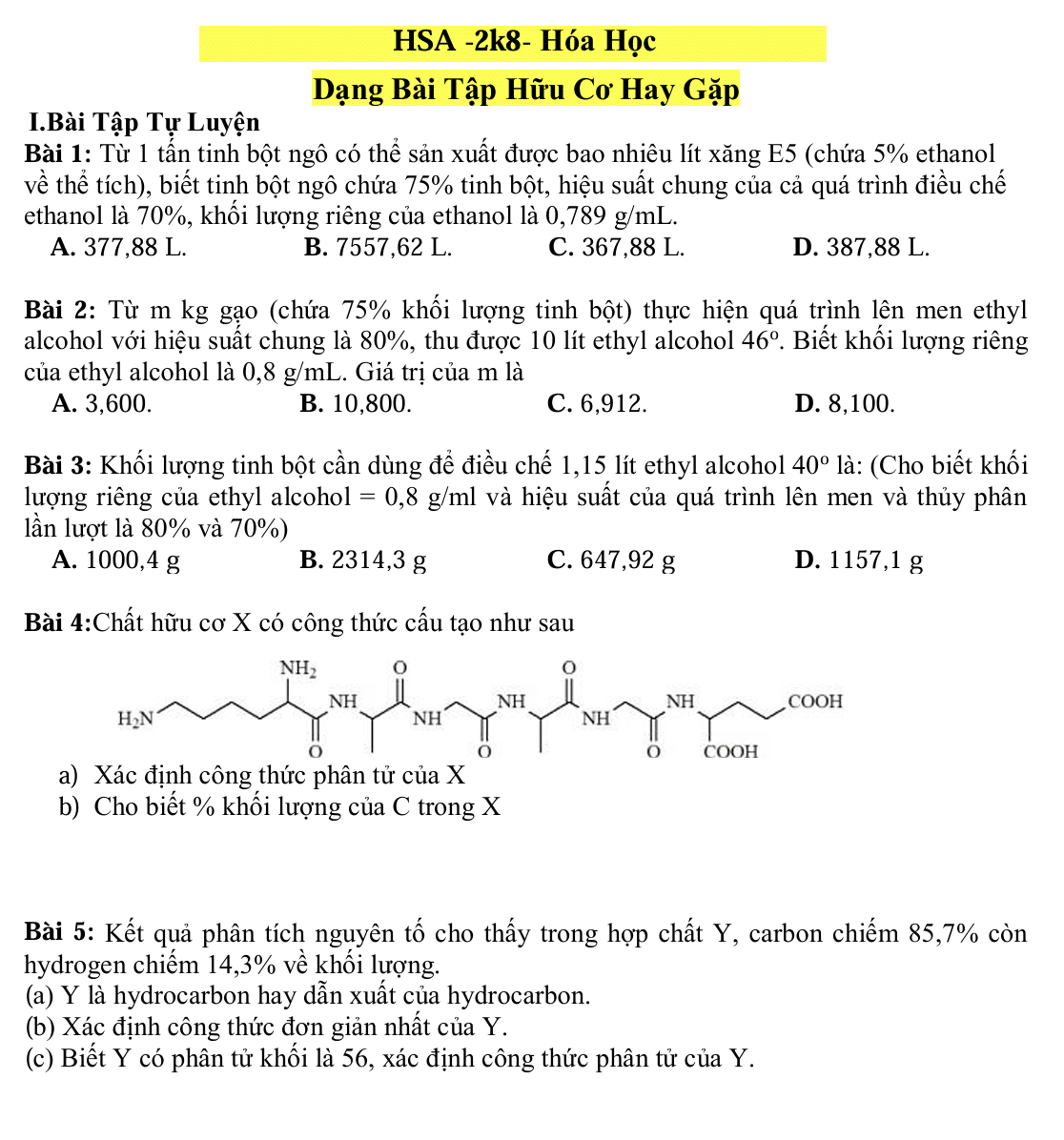 Bài tập hóa học hữu cơ trong kỳ thi ĐGNL Hà Nội 2K8 có xu hướng kiểm tra kiến thức từ cơ bản đến nâng cao, đặc biệt tập trung vào phản ứng, công thức phân tử, khối lượng mol và liên kết hóa học. Các câu hỏi thường đi sâu vào cách tính toán khối lượng, hiệu suất phản ứng, xác định công thức phân tử và tính chất hóa học.
