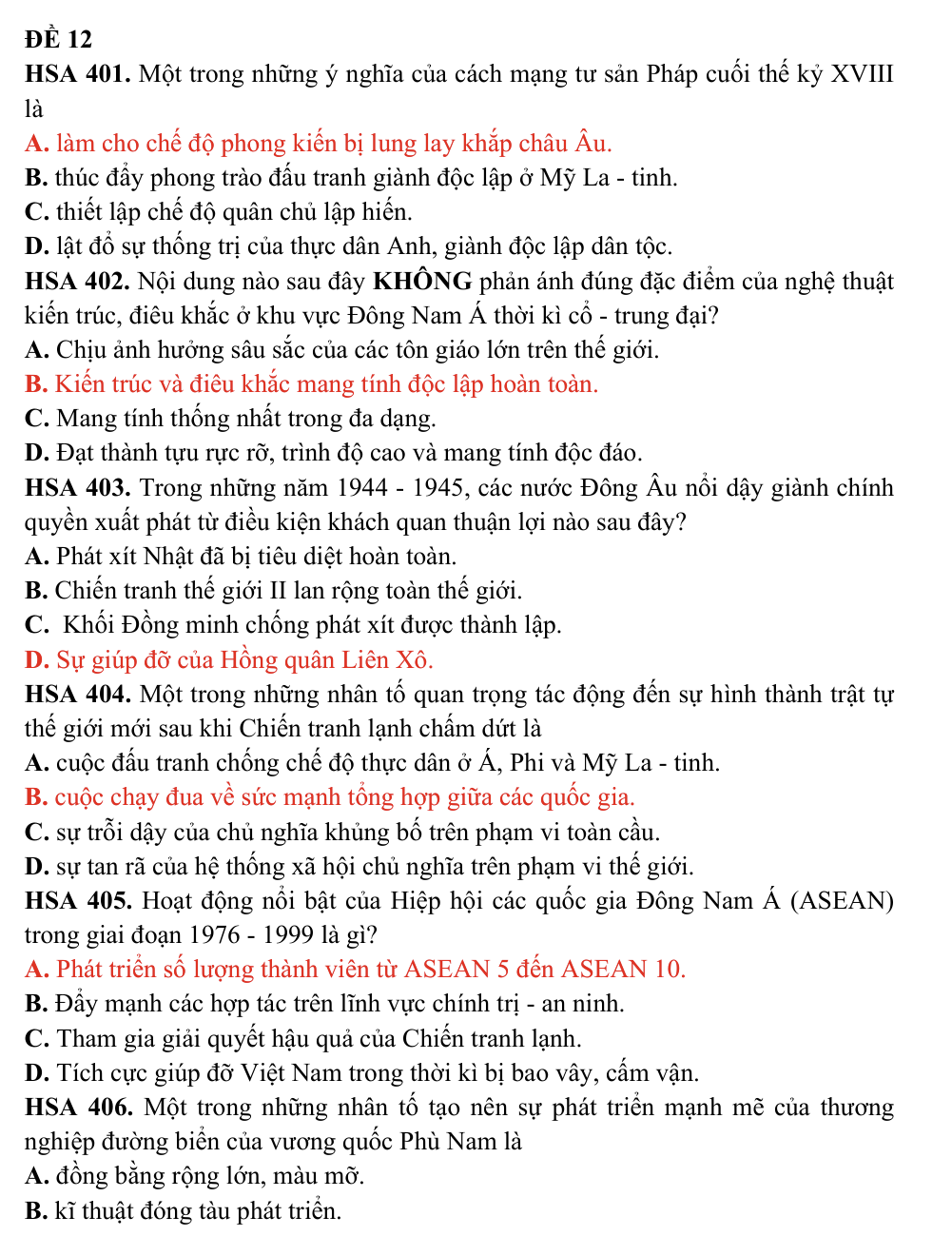 Đề 12 Trọng tâm Sử Đánh giá năng lực (ĐGNL) Hà Nội 2025 là một trong những đề luyện tập quan trọng giúp thí sinh chuẩn bị tốt nhất cho kỳ thi sắp tới. Dưới đây là đáp án chi tiết kèm giải thích, giúp học sinh hiểu rõ kiến thức và cách chọn đáp án đúng.