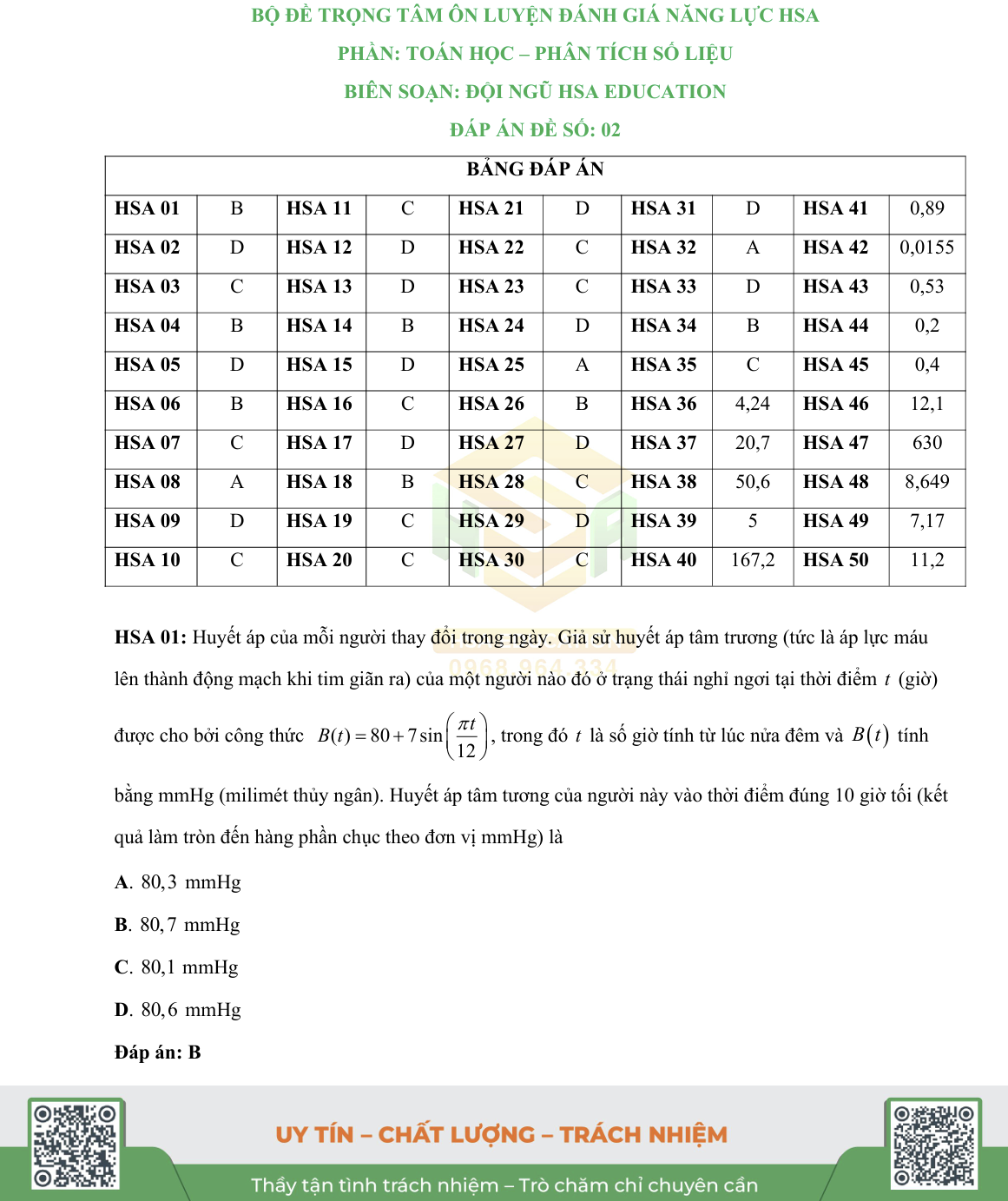 Bộ đề số 2 của HSA EDU bao gồm 50 câu hỏi với đa dạng các dạng bài toán, từ những bài yêu cầu tính toán đơn giản đến các bài phân tích và suy luận sâu hơn. Đáp án chi tiết được cung cấp giúp thí sinh dễ dàng đối chiếu kết quả và rút ra bài học từ những sai sót của mình.