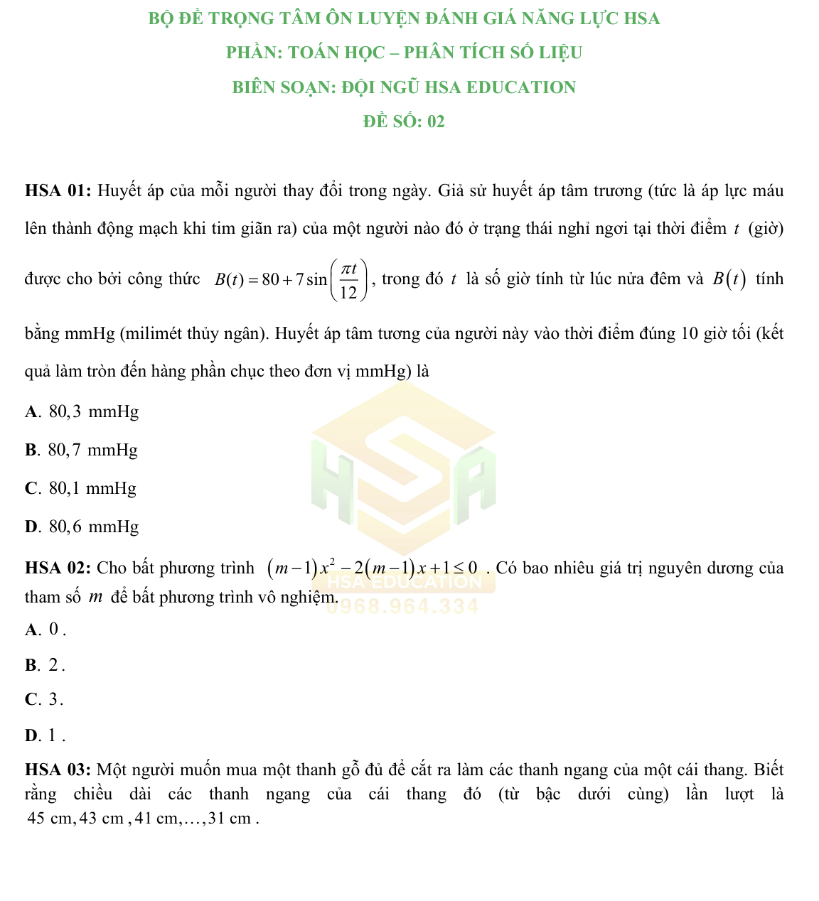 Bài thi Đánh giá năng lực (ĐGNL) Hà Nội 2025 là một trong những kỳ thi quan trọng, giúp đánh giá toàn diện tư duy logic, khả năng tính toán và phân tích số liệu của thí sinh. Trong đó, Đề 2 trọng tâm Toán học – Phân tích số liệu được biên soạn bởi đội ngũ HSA Education mang đến một hệ thống câu hỏi phong phú, bám sát cấu trúc đề thi chính thức.