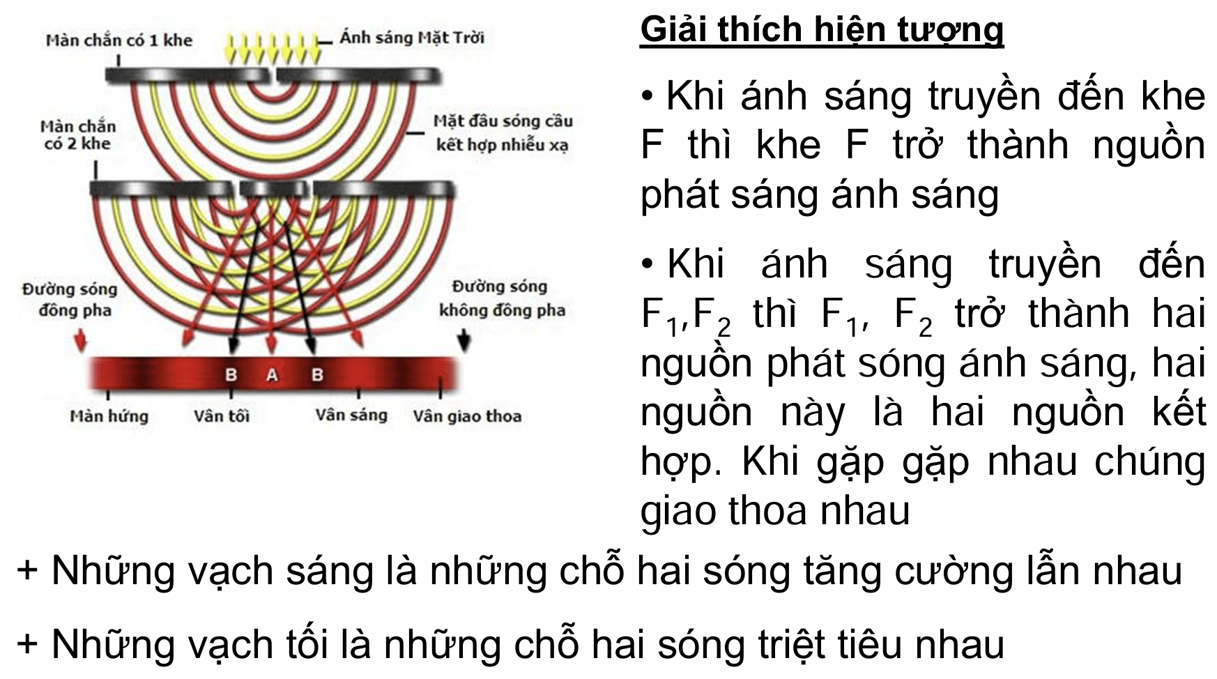 - Giải thích: và trở thành hai nguồn phát sóng thứ cấp cùng tần số và có độ lệch pha không đổi (do cùng được kích thích bởi nguồn ). Khi các sóng này gặp nhau trên màn , chúng sẽ giao thoa.