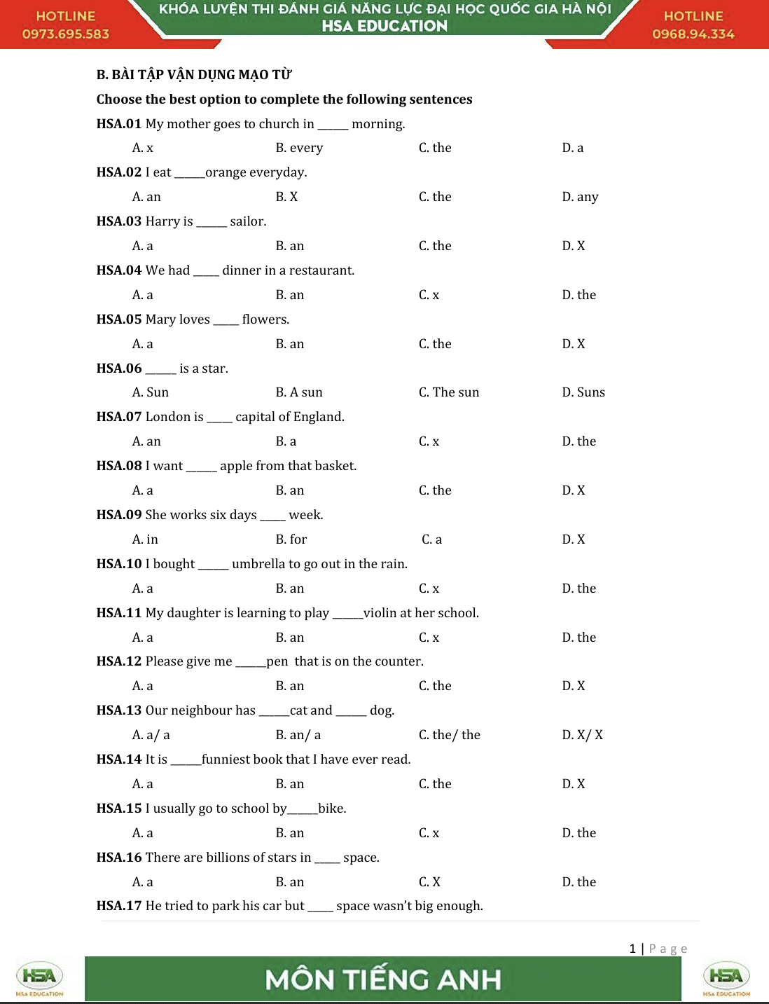 TỔNG ÔN MẠO TỪ – TIẾNG ANH ĐÁNH GIÁ NĂNG LỰC HÀ NỘI